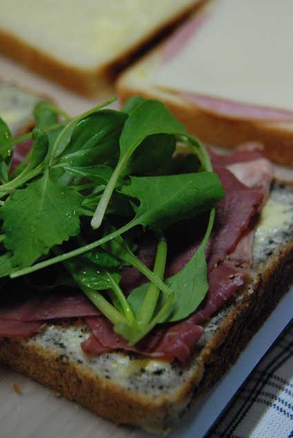 その上にスライスしたパストラミビーフと香りの強いベビーリーフをのせてサンド!!