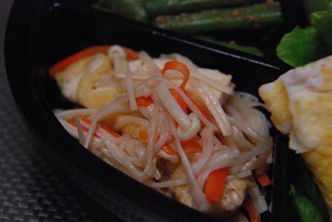 薄揚げは熱湯をかけて油をとり、ニンジンやエノキとともに切る。