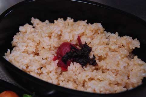くんちゃんちで買った玄米でご飯。真ん中に梅干しを半分。だって大きいんだもん。