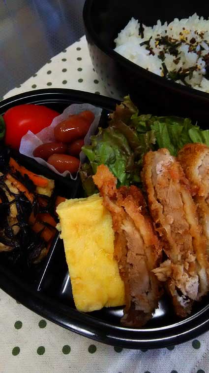 ヒレカツと厚焼きたまご、五目ひじきにミニトマトと煮豆の