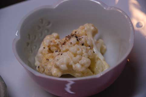 カリフラワーのカレーマヨネーズ和え。インパクトにほんの少し黒コショウを…