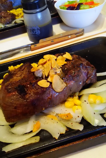 しばらくして鉄のお皿に乗った大きな牛ヒレ肉のかたまりが