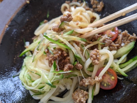 ひき肉と野菜が麺に絡むようにお箸で挟んで口へと運ぶと、