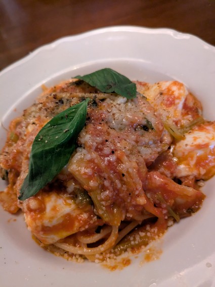 トマトソースと絡み合ってさらに旨さを増しパスタを包んでいる。