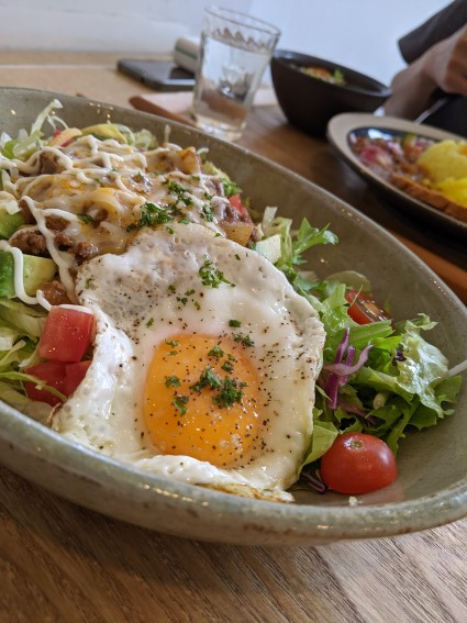 半熟卵を崩しながらご飯や生野菜と混ぜて食べる。