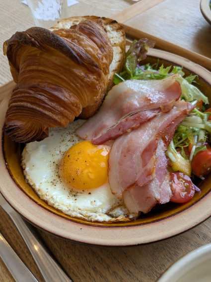 ジューシーなベーコンと半熟卵が旨い朝食!!を証明している。
