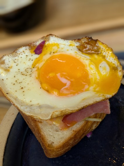 私はトーストの上にベーコンと卵を乗せて・・・