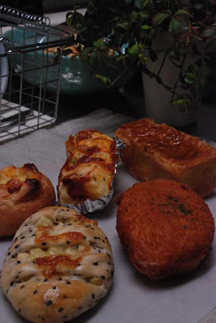 クリームチーズのドーナツと、チーズスティック、おはぎあんパン、シチューパン