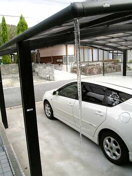 毎日毎日、寒いなあ~っと駐車場を見たら、ながーーーいツララがあった。