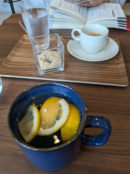 夫はエスプレッソ、私はホットレモネードを作ってもらい