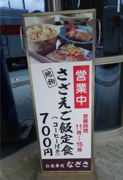 マリンプラザの前に行ってみると「さざえご飯定食」の立て看板が!!