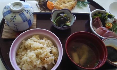 さざえご飯に潮汁、お刺身にアジフライ、茶わん蒸しまである~~@@
