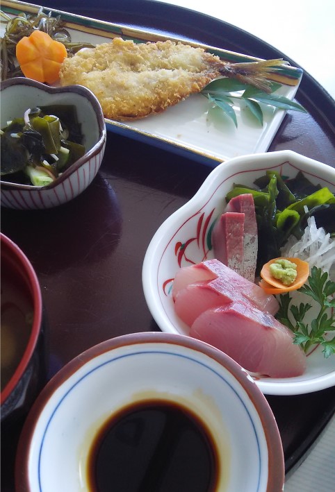窓に向かって席に座り、青い海を眺めていると定食が運ばれてきた。