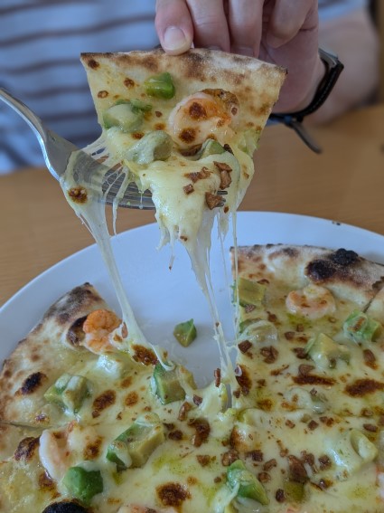 森のレストランのアボカドとエビのピザ