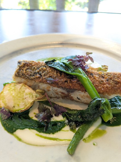 メインの浜田港サワラ 紫蘇の実パン粉焼き 蕪のソース