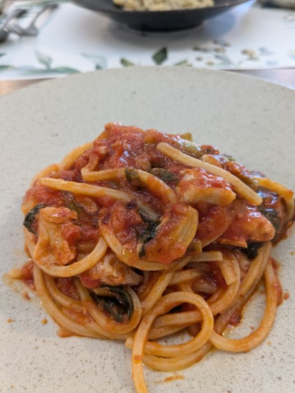 このソースをキタッラの四角くてもっちりしたパスタがよく絡めて