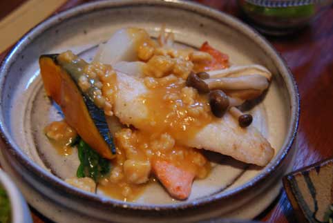サケと白身魚のソテー 独特な手作りのお味噌で仕上げてありました。