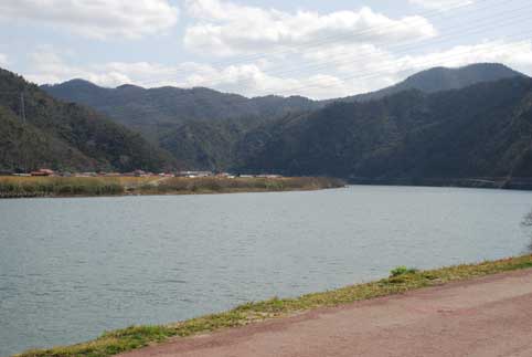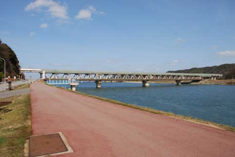 豆茶香を出てすぐ前にある土手にあがると、ゆったりと流れる江の川が広がります。