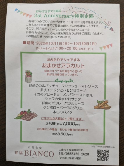 吉山ビアンコへ行ってから急に有福ビアンコの料理も食べたくなって