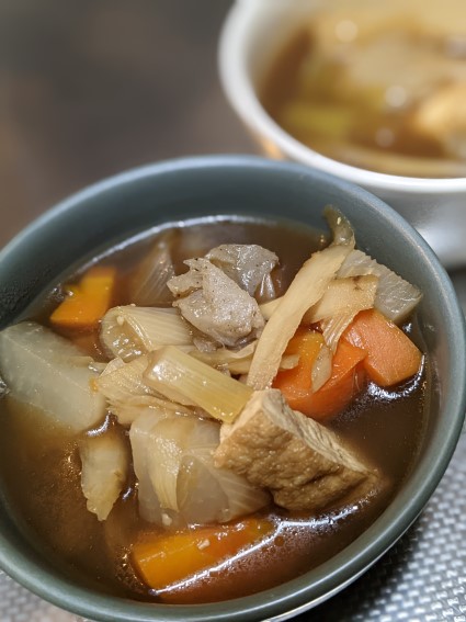 根菜類を中心にこんにゃくや厚揚げなどを入れて作るので