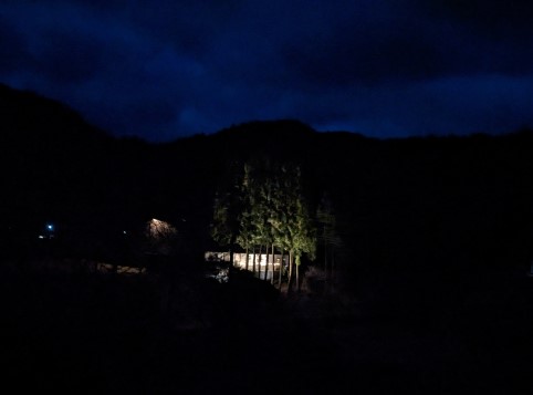 雪が少し残っている道を走り抜けると、森の中に温かな灯りがある。