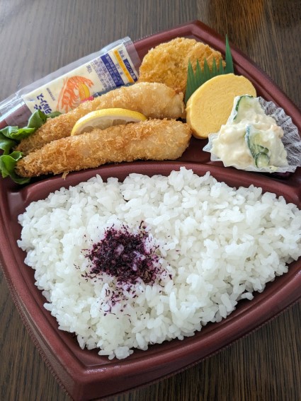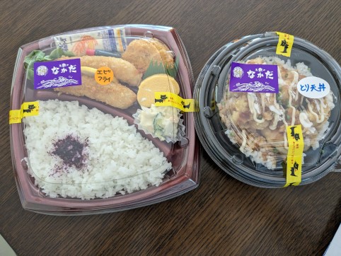 色んな美味しそうなお弁当が並ぶ中で夫はエビフライ弁当、私はとり天丼