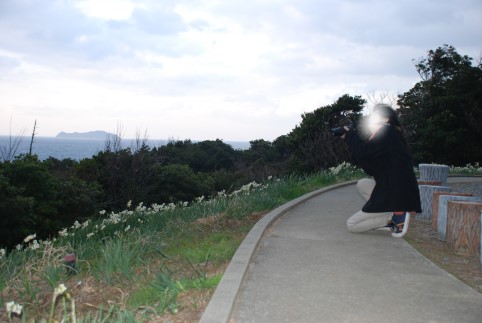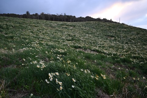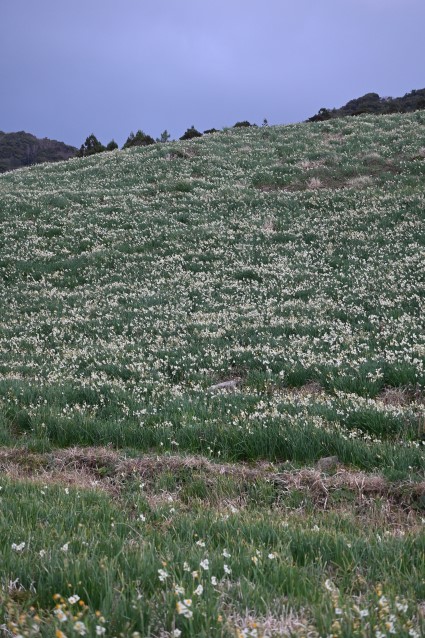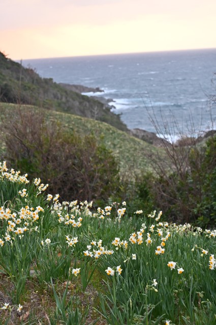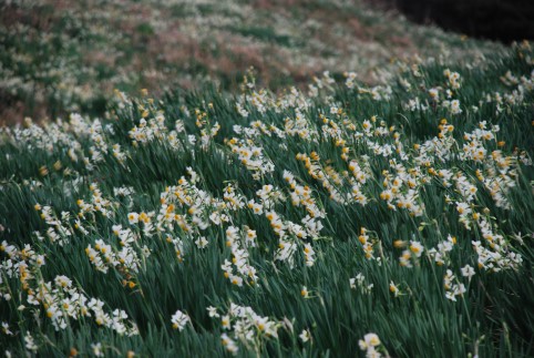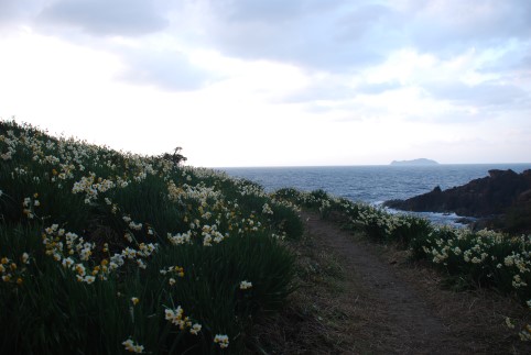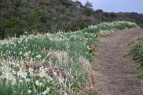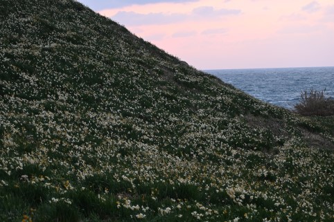 海風が強く吹いてくる崖に水仙の群れ。