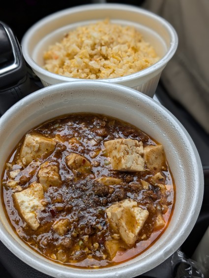 夫が杏で麻婆丼と海老炒飯をテイクアウトしてくれていた。