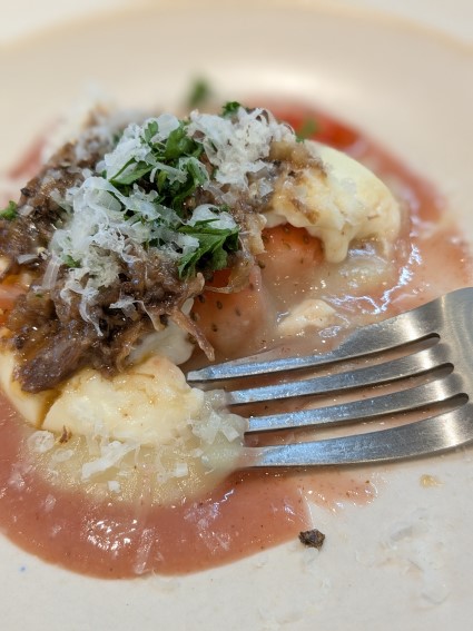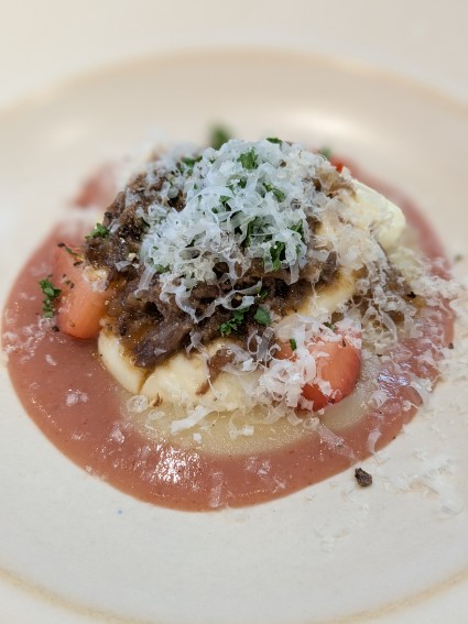 ジャガイモといちごと牛テールの煮込んだもののグラタン
