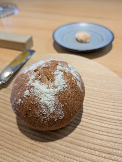 今日はフォカッチャじゃなくて丸い全粒のパンといちごのバター