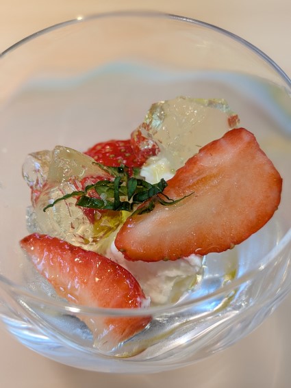いちごとトマトのムースの下にはフグのタルタルやいちごが隠れている。