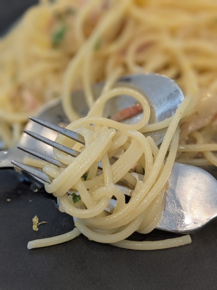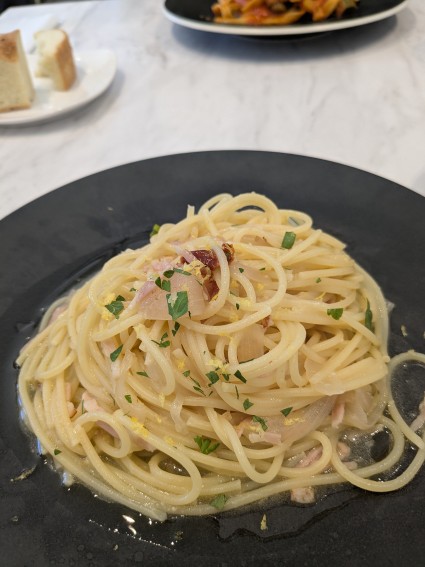 ニンニクがガツンと効いていて、そこにベーコンとピリリな唐辛子