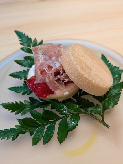 小さな前菜のクリームとスモモ、ハムのもなか