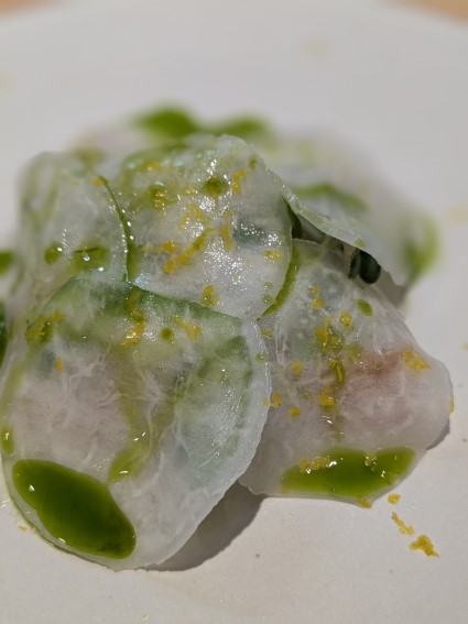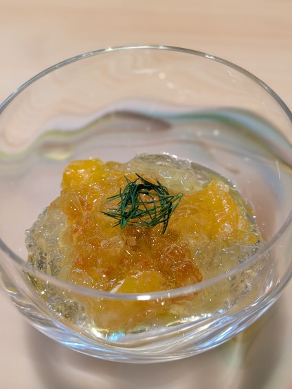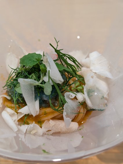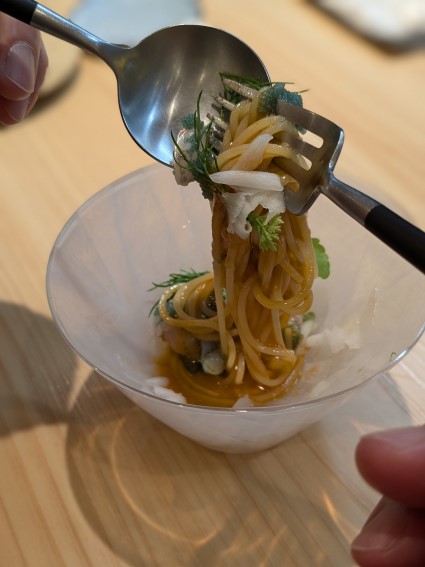 冷製のパスタを使った前菜で、素材の使い方にはいつも驚かされる。