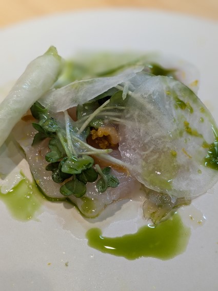 浜田産の鰹にリンゴとセロリのソースとナッツが入っていて、