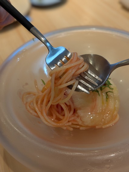 果物を使った冷製パスタはアシェットデセールAluさんでも食べていて