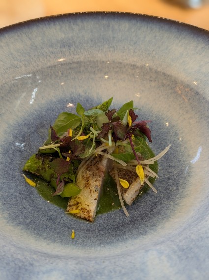 ほろっと優しい苦味のソースが炙ったカマスとよくあう。