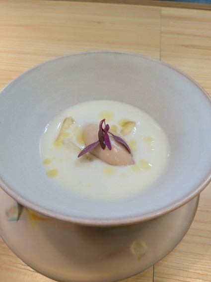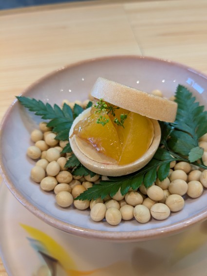桃のジェラードにカットした桃が冷たいジャガイモのスープに入っている。