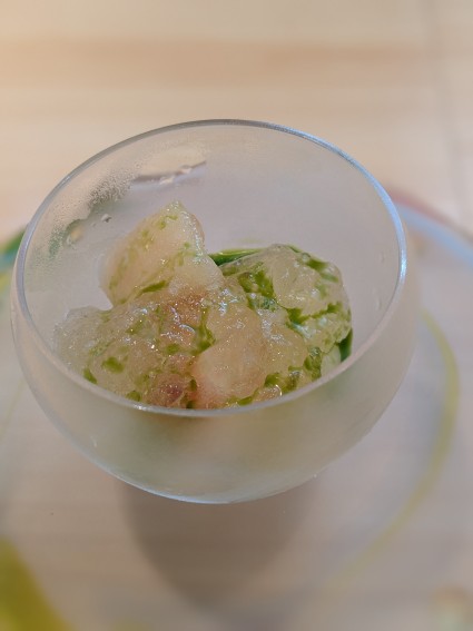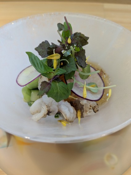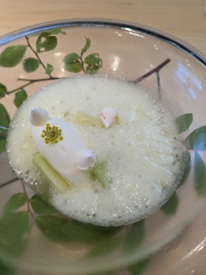 Ruruの2皿目は鱧と鱒の卵、きゅうり、オクラ、枝豆のコンソメ