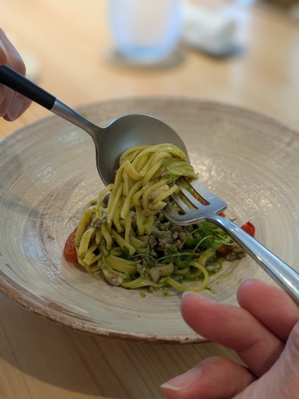 真蛸、豚足、バジリコ、ライムを使ったパスタ