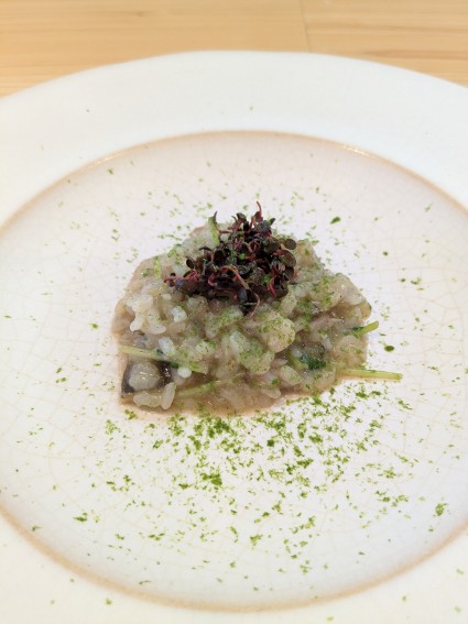 Ruruさんの鮎、肝、餅米、ズッキーニ、木の芽を使ったひと皿