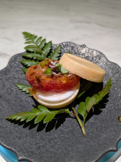 最初のお皿は根セロリとトマトバジリコが使われている前菜