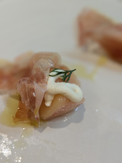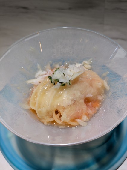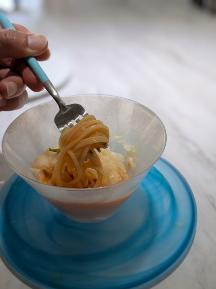 Aluの2皿目の前菜で桃を使った冷製パスタ