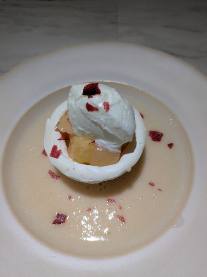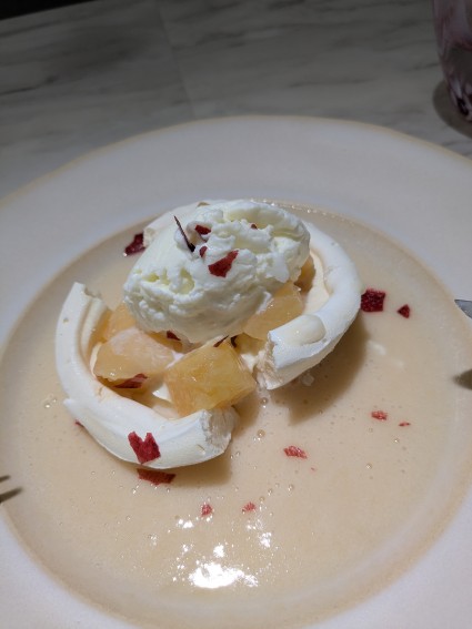 淡いメレンゲの器にたっぷりと桃がのせられて