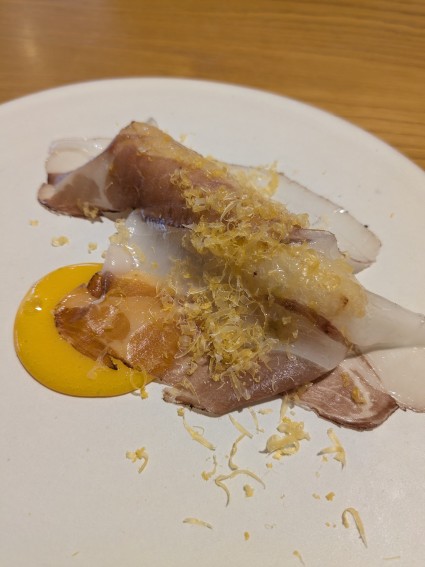 イノシシのスライス肉の塩味とまったり卵黄のソースで