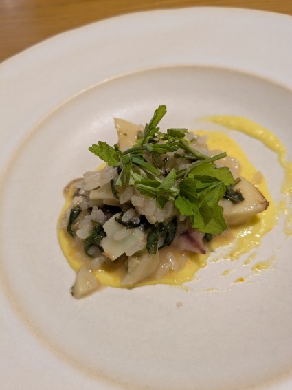 タケノコと八朔、ホタルイカとよもぎ、山椒にもち米の料理で