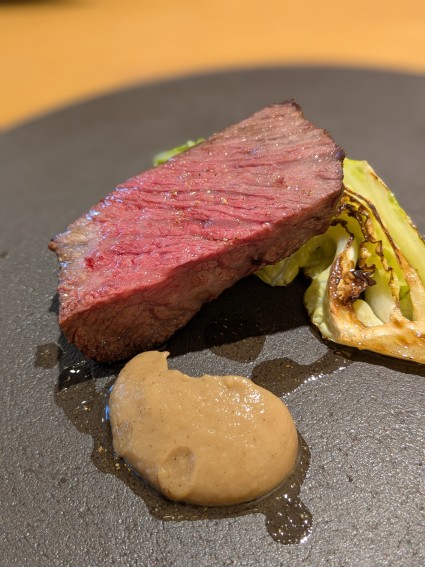 メインの藁焼きで香りを付けた京村牛とカリフラワーのソース