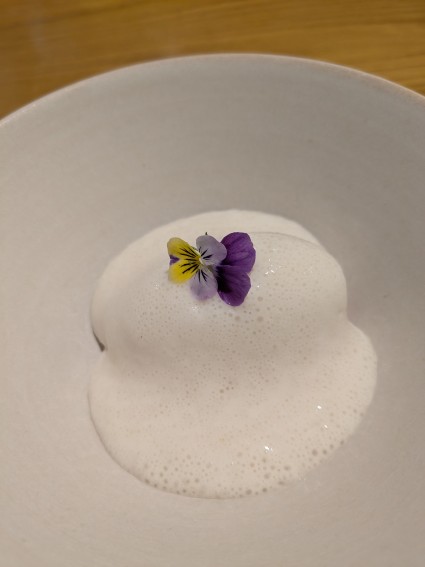 最初の前菜は新玉ねぎのアイスクリームに菜の花のソースと雲丹