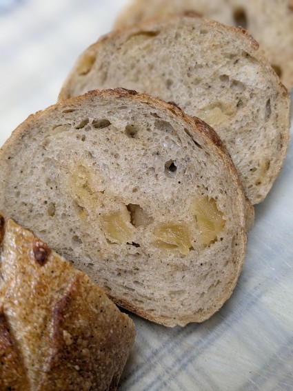 カリカリに焼かれた生地にざっくりとナイフを入れると
