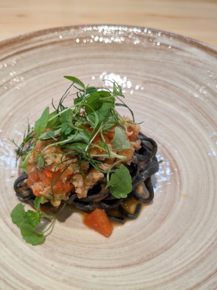パスタにイカスミが混ぜてあってトマトの色によくあってとてもきれいだ。